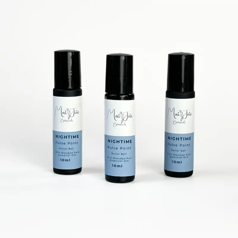 Drift into a peaceful slumber with Mai Joie’s Aromatherapy Pulse Point Roller Ball - Nighttime, designed to support relaxation and prepare you for a restful night. Infused with the calming aromas of Frankincense, Lavender, Ylang Ylang, and Orange essential oils, this blend is formulated to help you unwind and quiet the mind. Frankincense offers a grounding, earthy scent that encourages a tranquil state, while Lavender provides gentle floral notes that soothe tension. Ylang Ylang adds a subtle sweetness, promoting calm, and Orange brings a soft citrus brightness, helping to relieve stress and promote comfort.