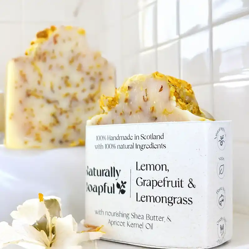 The handmade Lemon Grapefruit and Lemongrass Soap Bar adds a beautiful second layer to the experience. Carefully made in Scotland using traditional methods, this natural apothecary style soap blends a trio of citrus essential oils to create a fresh and uplifting aroma. The soap contains calendula petals which add a pretty golden touch and a sense of natural nourishment. The creamy lather feels gentle on the skin, leaving it fresh, soft and lightly scented with a clean citrus aroma.