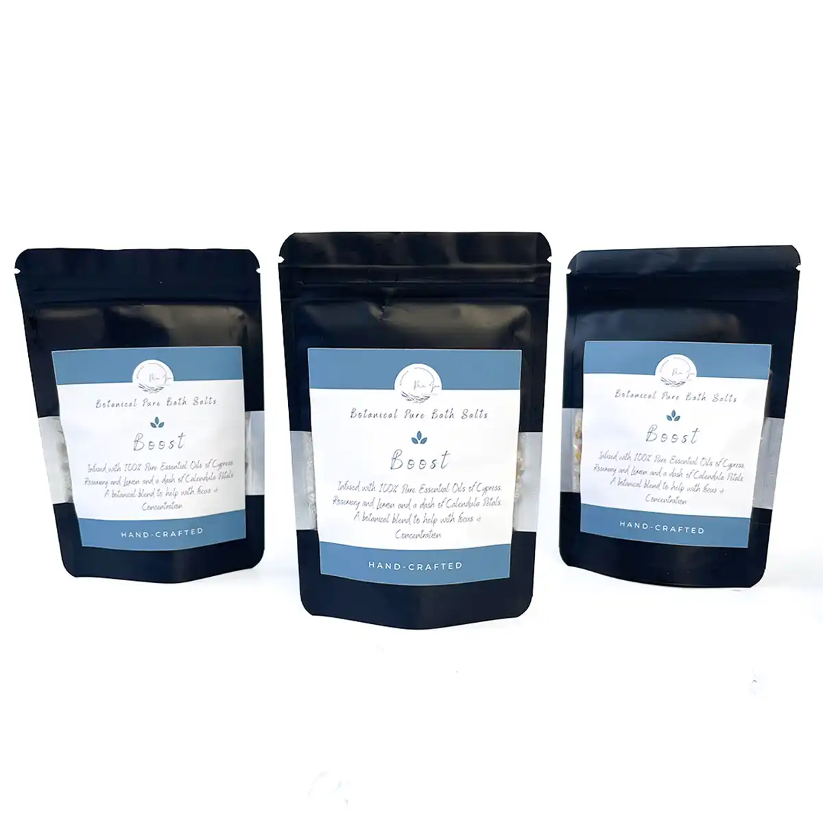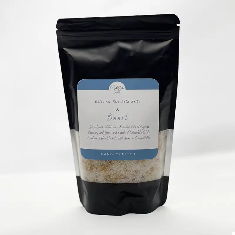 Boost Pure Botanical bath Salts are Infused with 100% Pure Essential Oils of Cypress, Rosemary and Lemon and a dash of Calendula Petals. A botanical blend to help with focus & Concentration