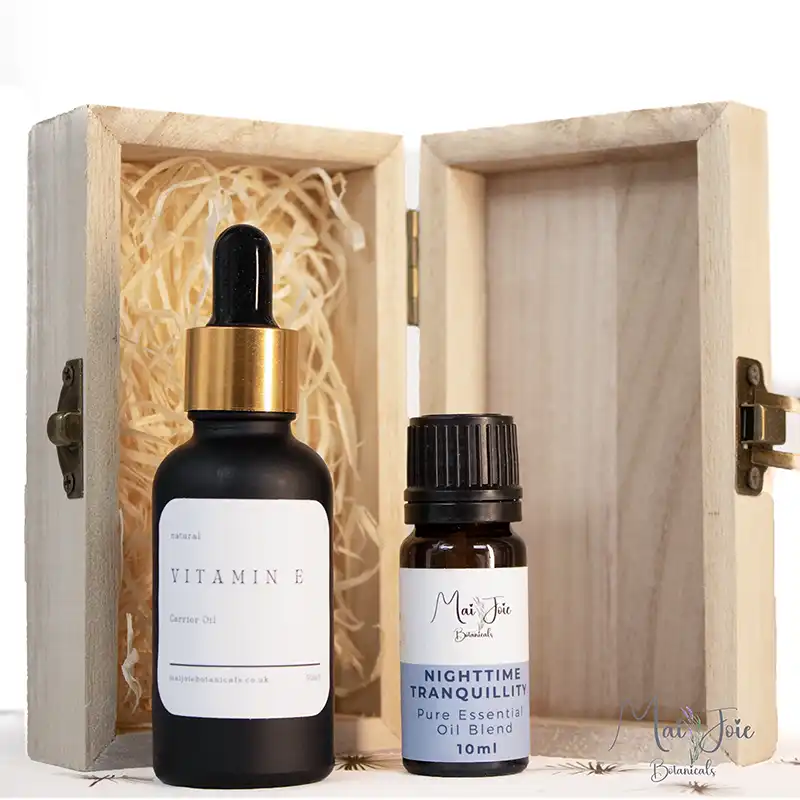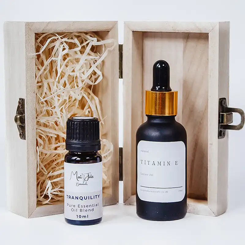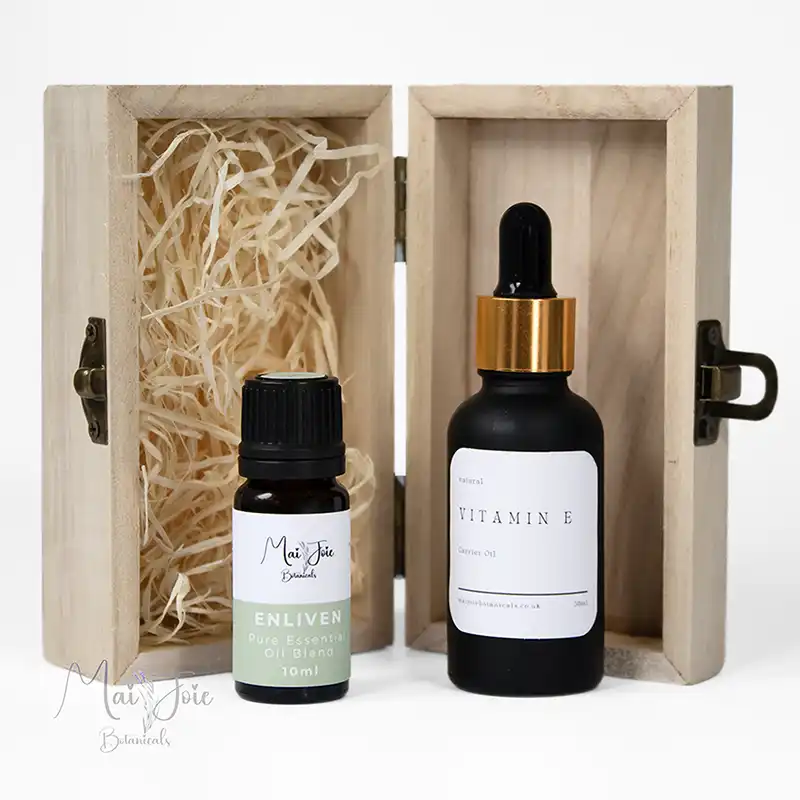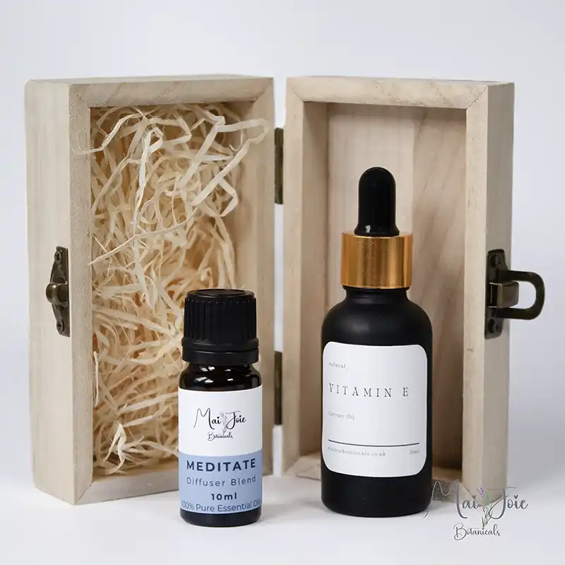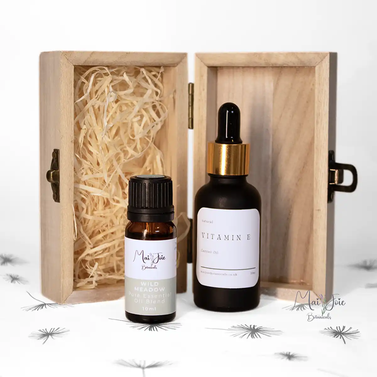 The Create Your Own Aromatherapy Oil (Kit) has been created for you to enjoy making your own face or body oil along with making you huge savings. The benefits of natural skincare with the Create Your Own Aromatherapy Oil (Kit) — a luxurious and customisable way to nourish and care for your skin. Thoughtfully presented in a reusable wooden box, this kit allows you to blend your own bespoke aromatherapy oil at home, combining the hydrating properties of Vitamin E with the pure botanical goodness of essential oils. Whether for daily skincare, a soothing body treatment, or a thoughtful gift, this set provides everything needed for a safe and effective oil blend.