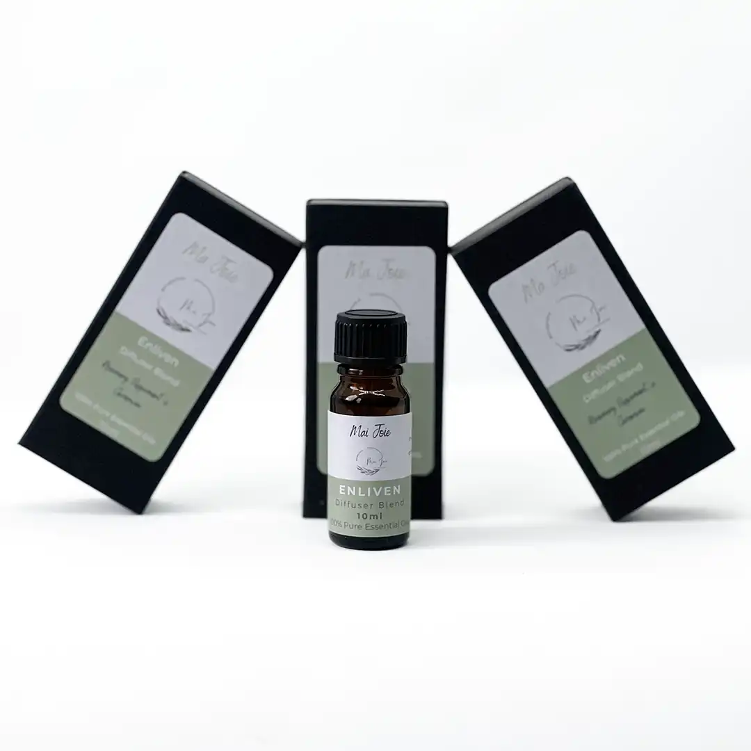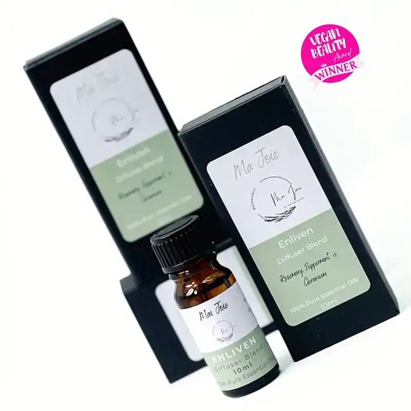Indulge your senses, embrace nature's embrace, and awaken a world of well-being with Mai Joie Enliven Pure Essential Oil Blend. Experience the harmonious convergence of Rosemary, Peppermint, and Geranium essential oils, and embark on a path to a more invigorated and joyful you.