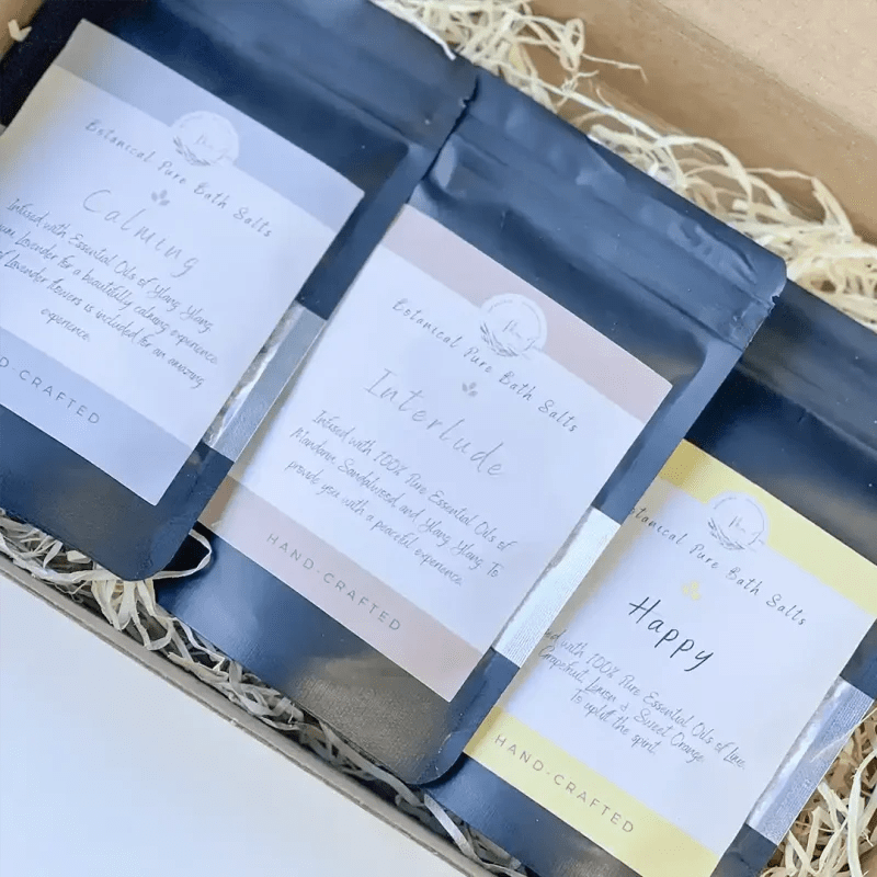 This Mix and match gift Box contains 3 x 75g Packets of Pure Botanical Salts: