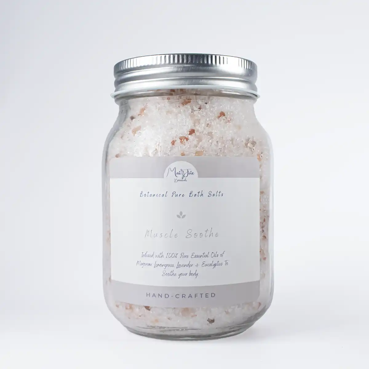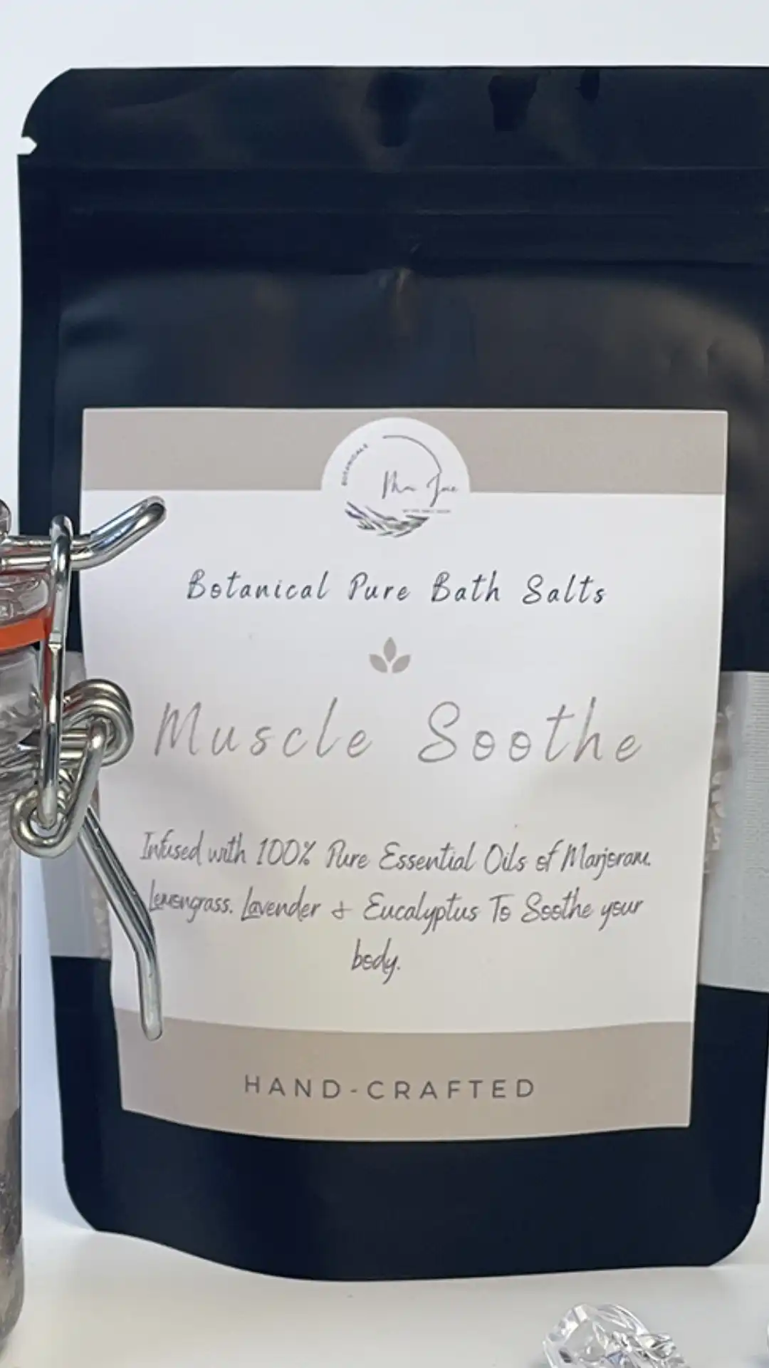 Muscle Soothe Pure Botanical bath Salts are Infused with 100% Pure Essential Oils of Marjoram, Lemongrass, Lavender & Eucalyptus To Soothe your body.