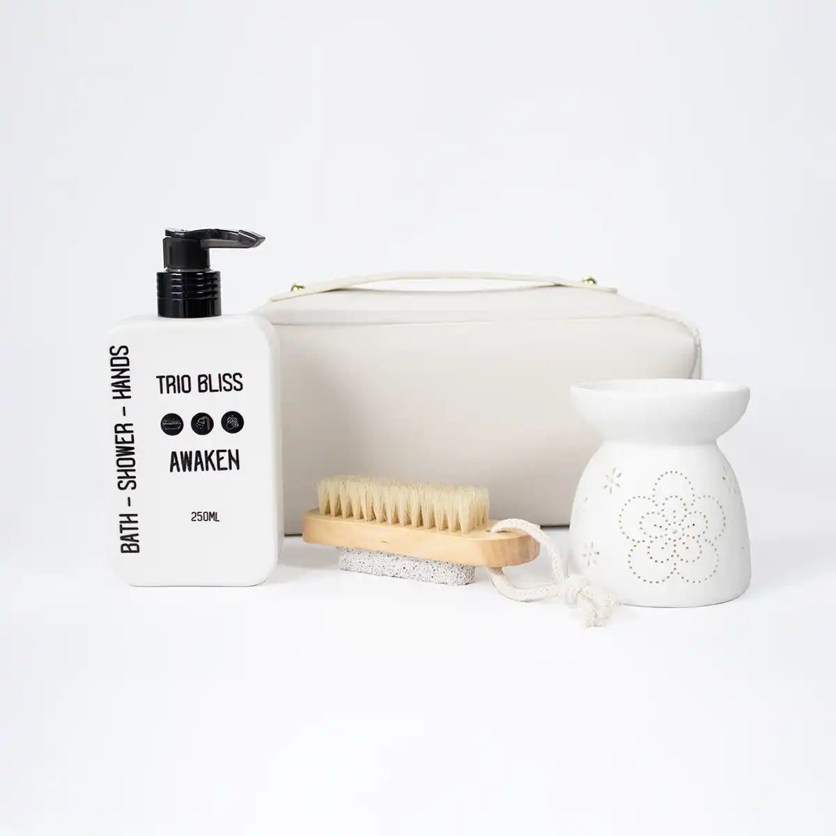 Awaken your senses with The Awakening Gift Bag. Featuring Trio Bliss Awaken, a flower oil burner, and a foot scrub brush, all presented in a soft pink PU leather bag, perfect for a refreshing self-care ritual.