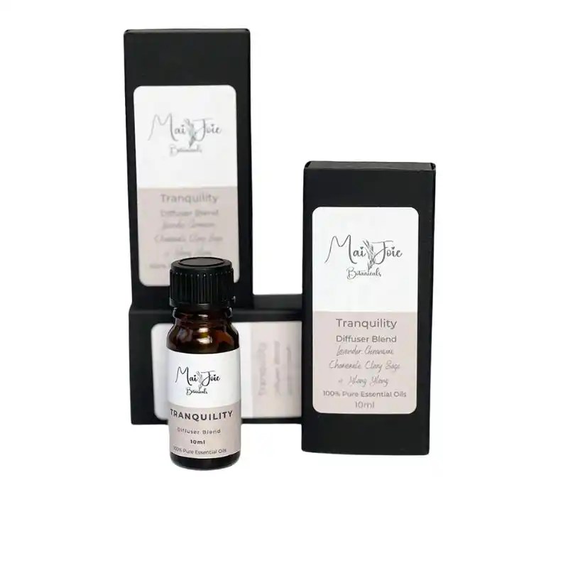 Welcome to the official Mai Joie website, where you'll discover our exquisite Peaceful Essential Oil - Mai Joie Tranquility Blend for Relaxation which is a 100% Pure Essential Oil Blend. Meticulously crafted to envelop your senses in a transcendent experience of calmness and peace, Tranquility is more than just a blend, it's a harmonious composition designed to raise your well-being. This bespoke creation artfully combines the delicate floral notes of Lavender and Geranium, the gentle sweetness of Roman Chamomile, the earthy sophistication of Clary Sage, and the exotic allure of Ylang Ylang. Together, these essential oils form a harmonious symphony that soothes the senses, promotes relaxation, and encourages a tranquil state of mind.